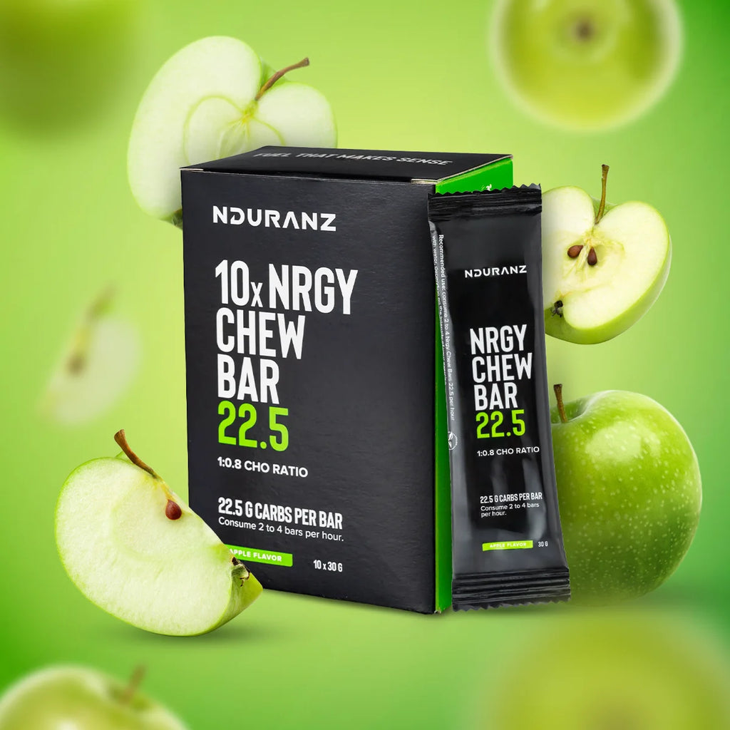Nrgy Chew Bar 22.5 Nduranz proporciona una dosis exacta de 22,5 gramos de carbohidratos de rápida absorción, lo que permite una alimentación precisa durante todo el entrenamiento.