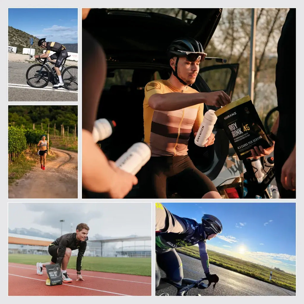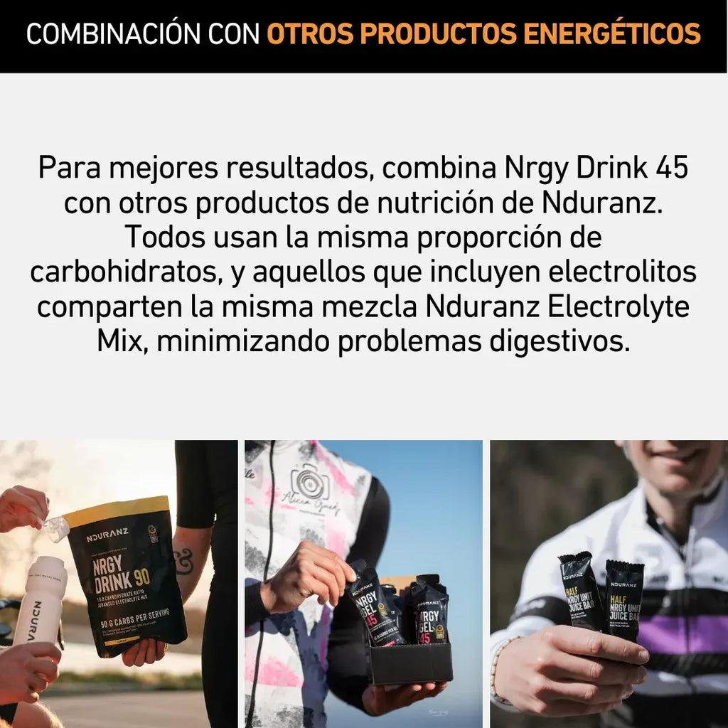 Para obtener los mejores resultados, combina Nrgy Drink 45 con otros productos energéticos de Nduranz. Todos utilizan la misma proporción de carbohidratos, y aquellos que incluyen electrolitos comparten la misma Mezcla de Electrolitos Nduranz — minimizando los problemas digestivos.