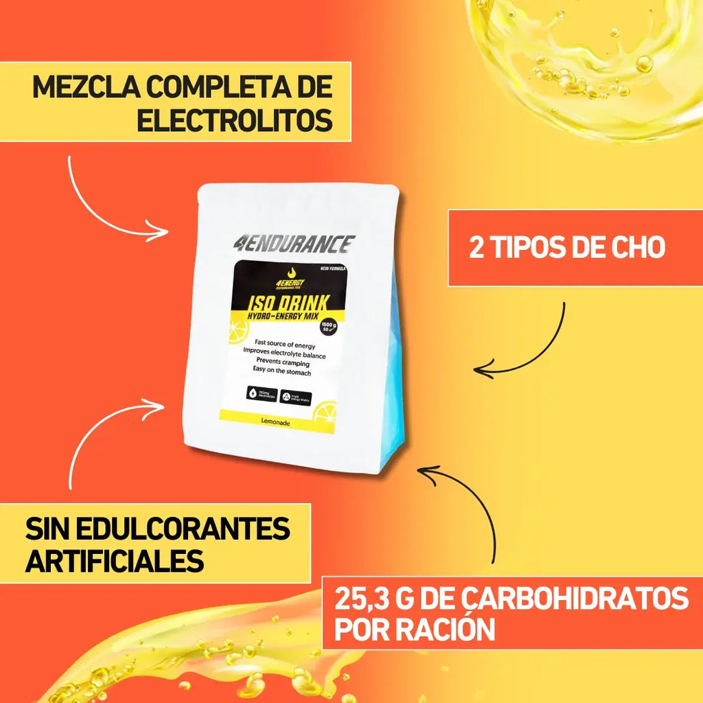 Iso Drink de 4Energy ha sido diseñada para atletas de resistencia que necesitan una fuente eficiente de energía para preservar las reservas de glucógeno y minerales que ayuden a mantenerse hidratados durante ejercicios de resistencia intensos.