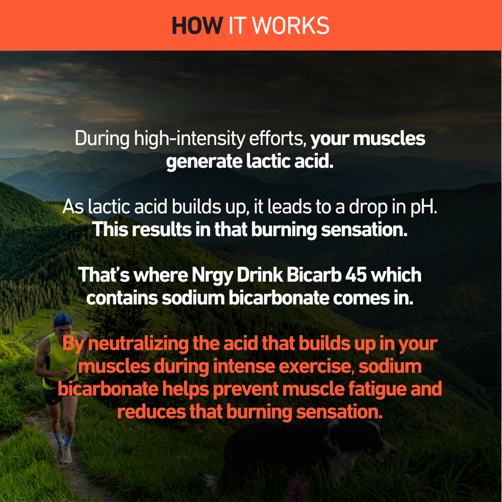 ¡Sigue corriendo, no sufriendo! Cuando tus piernas comiencen a arder, Nrgy Drink Bicarb 45 te ayuda a seguir adelante.