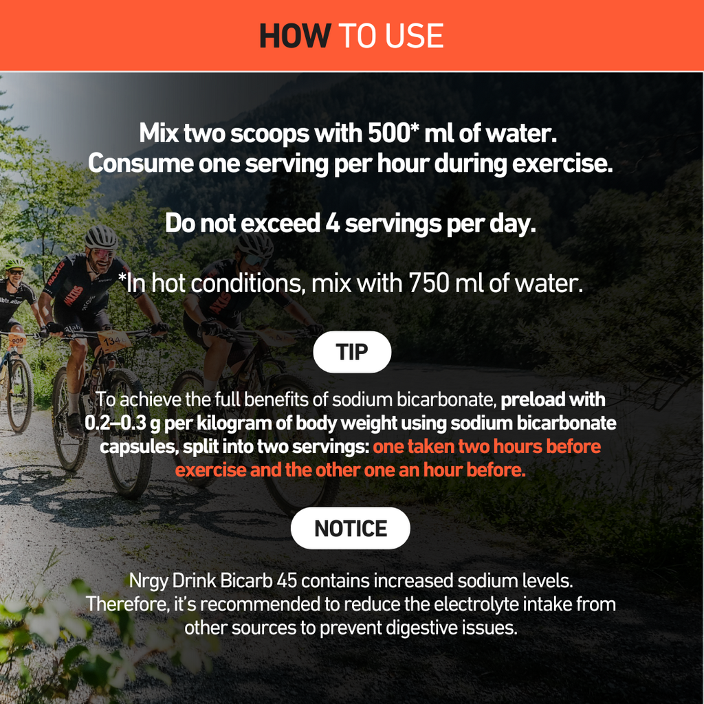 AVISO: Nrgy Drink Bicarb 45 contiene niveles elevados de sodio. Por lo tanto, se recomienda reducir la ingesta de electrolitos de otras fuentes para evitar molestias digestivas.