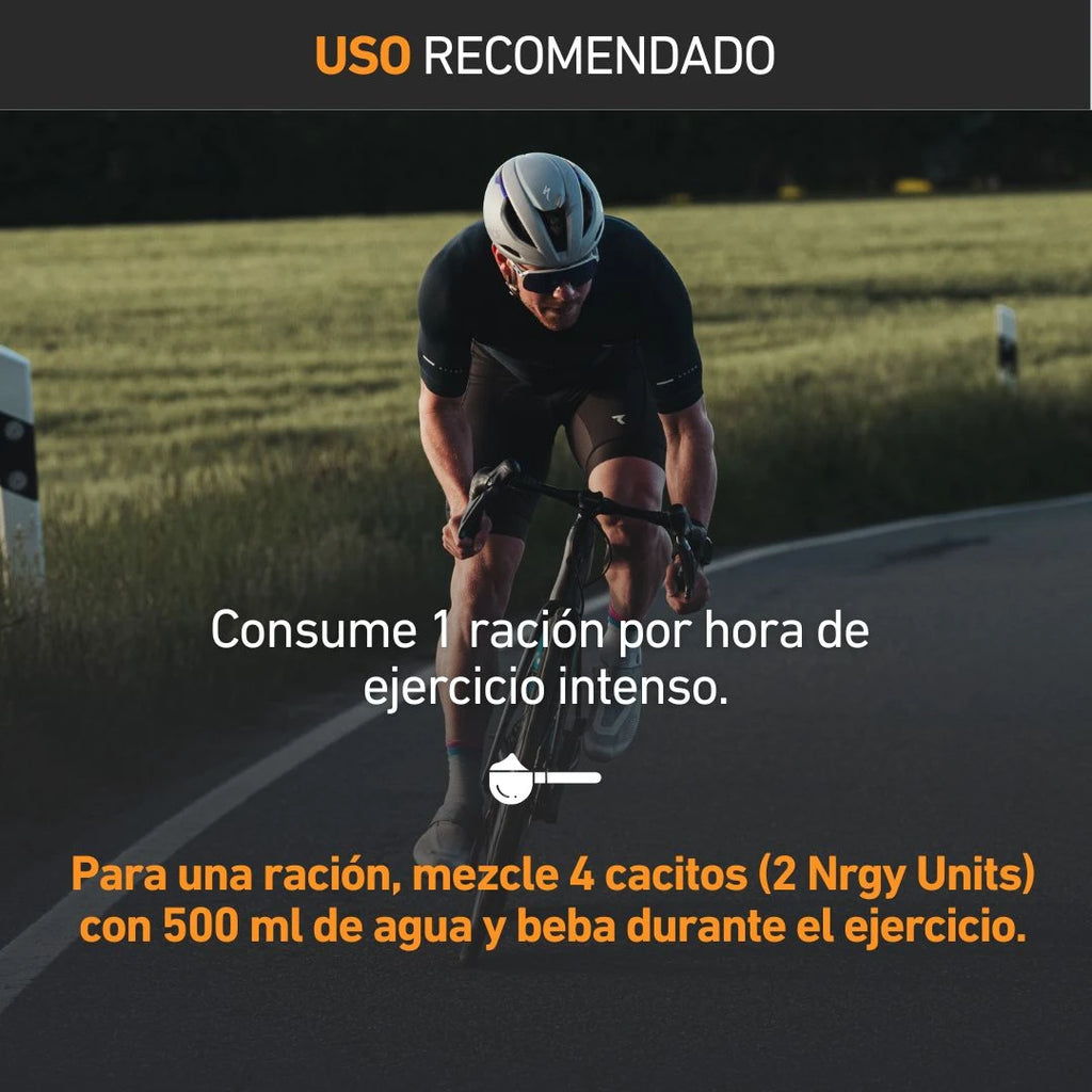 Nrgy Drink 90 es una bebida deportiva adaptada para una mayor ingesta de energía. Aunque ofrece la misma cantidad de CHO por cucharada (22,5 g) que Nrgy Drink 45, la cantidad de electrolitos y la intensidad del sabor están adaptadas a la mayor cantidad en una sola botella.