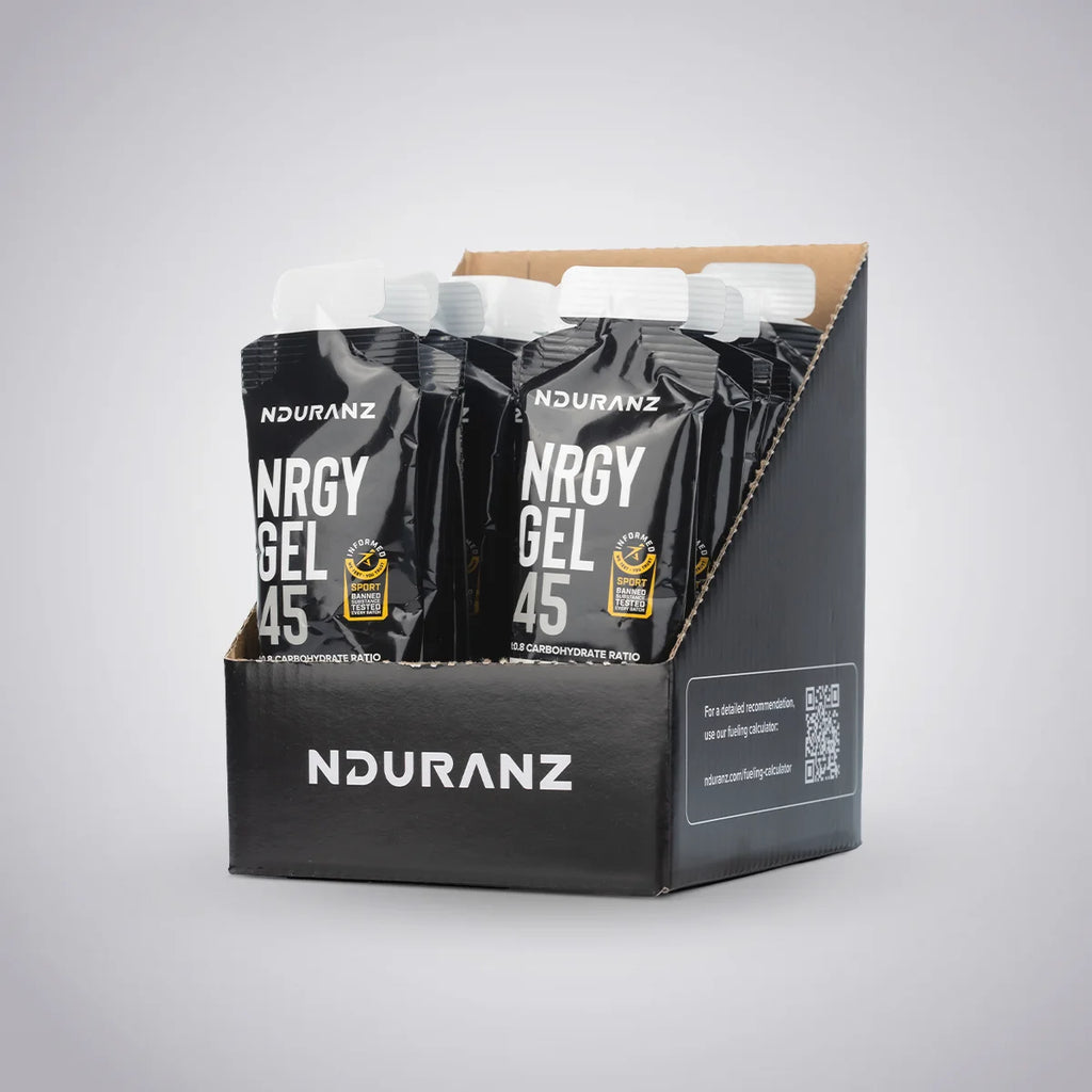 Nrgy Gel 45 (sin electrolitos) contiene glucosa (como maltodextrina) y fructosa. Como estos carbohidratos se absorben a través de diferentes transportadores en el intestino, combinarlos permite al cuerpo absorber más carbohidratos.