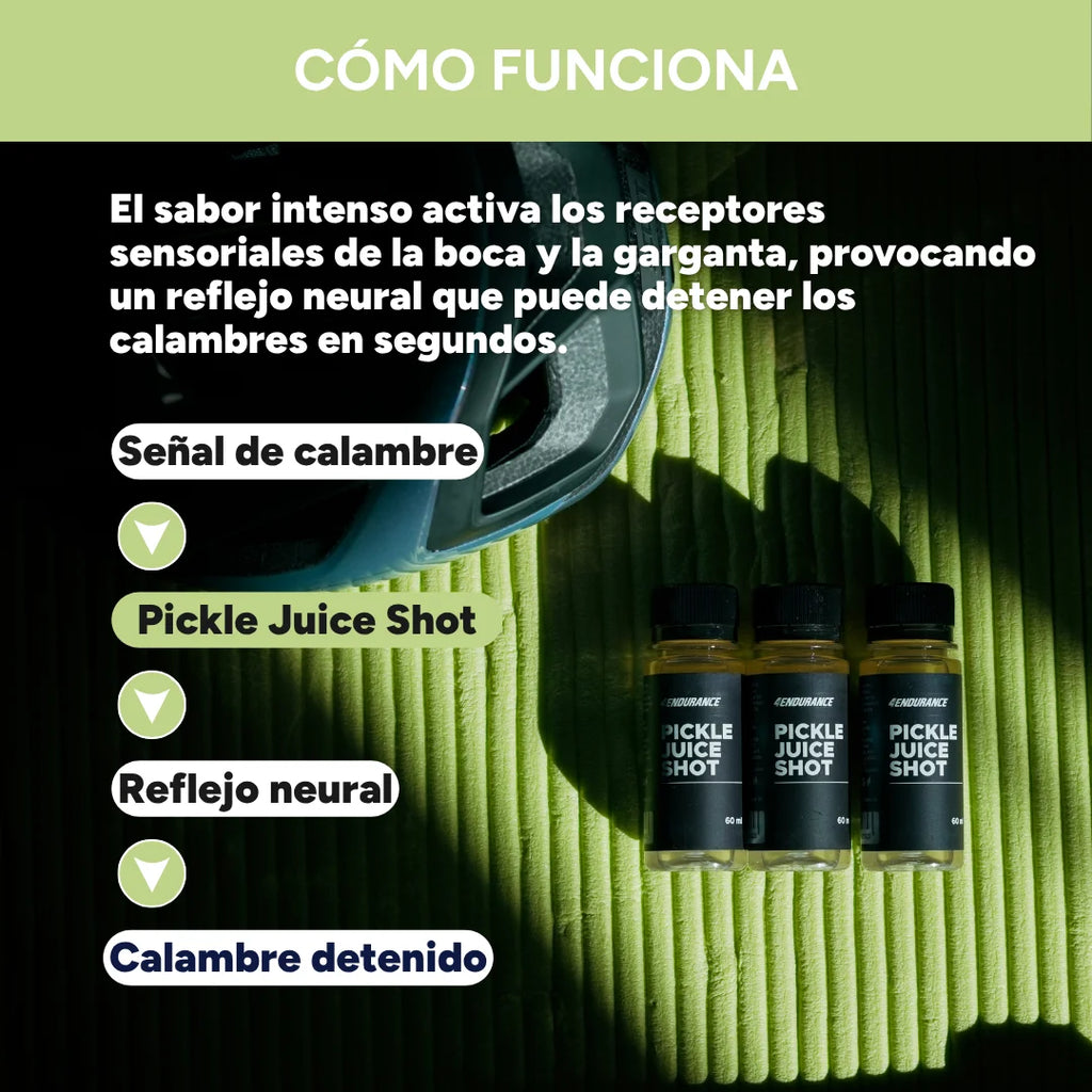 Debido a que actúa a través del sistema nervioso, Pickle Juice Shot funciona rápidamente — a menudo en cuestión de decenas de segundos — lo que lo hace especialmente útil durante la competición o sesiones de entrenamiento exigentes.