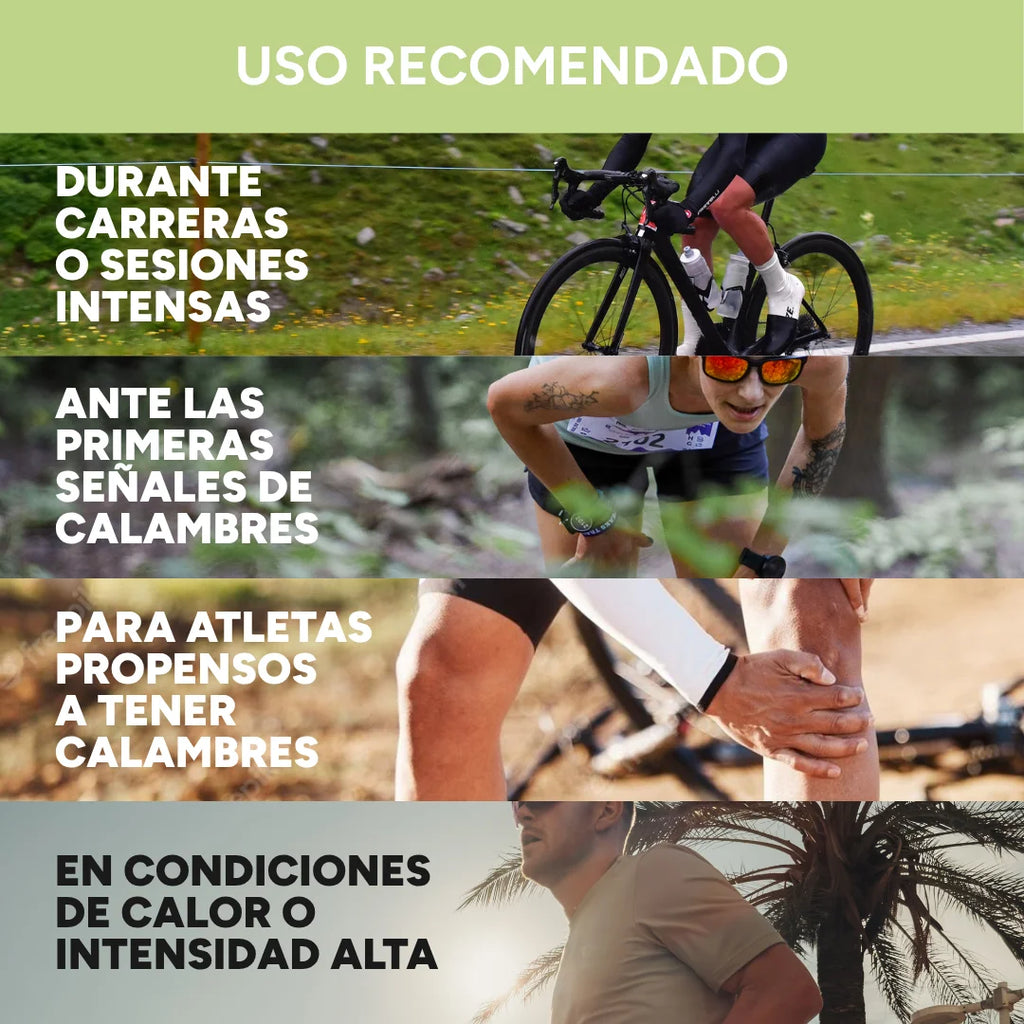 La fórmula también incluye electrolitos para apoyar el equilibrio de líquidos y la función neuromuscular. Aunque los electrolitos no detienen los calambres activos de forma inmediata, ayudan a reducir el riesgo de que aparezcan más adelante en la sesión.