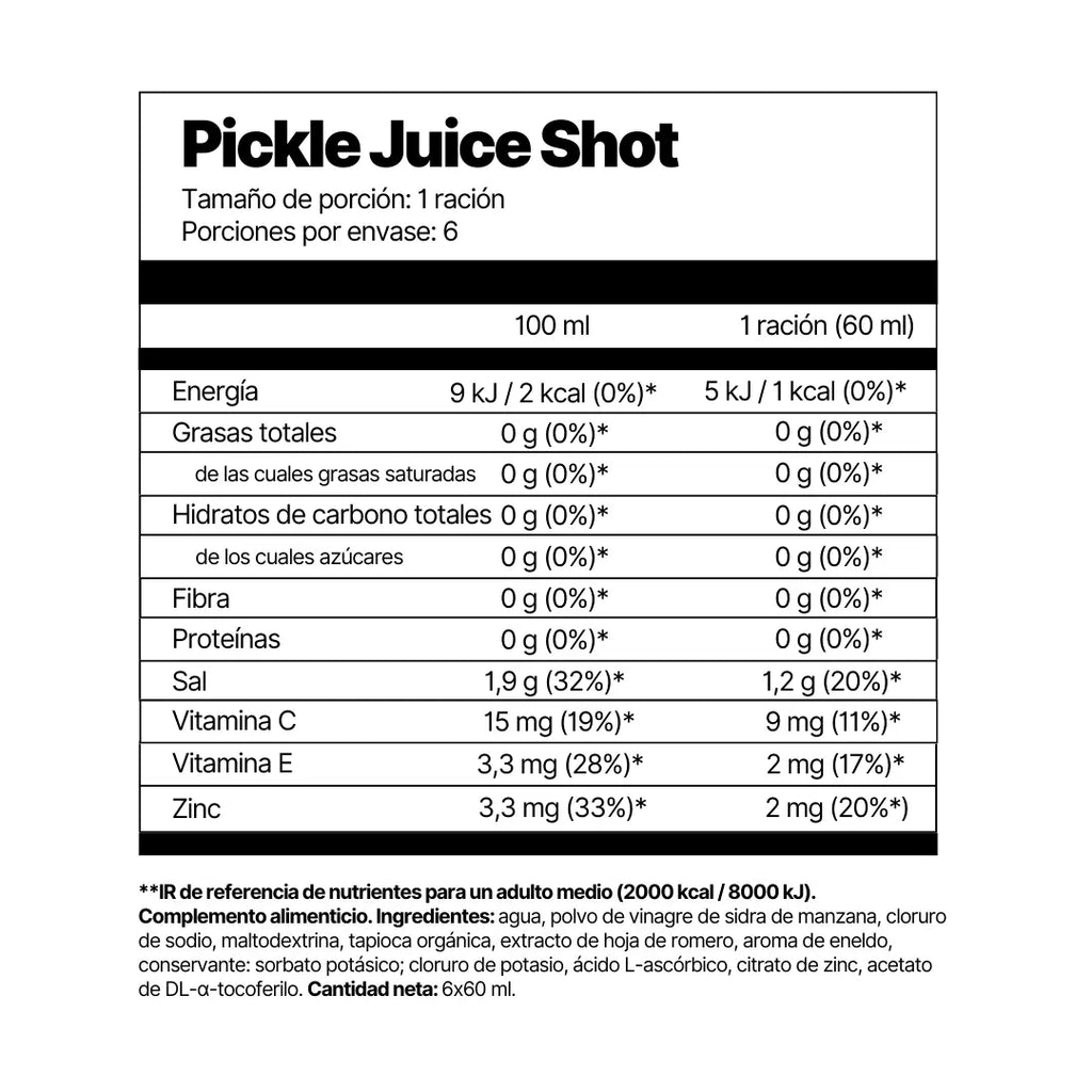 Debido a que actúa a través del sistema nervioso, Pickle Juice Shot funciona rápidamente — a menudo en cuestión de decenas de segundos — lo que lo hace especialmente útil durante la competición o sesiones de entrenamiento exigentes.