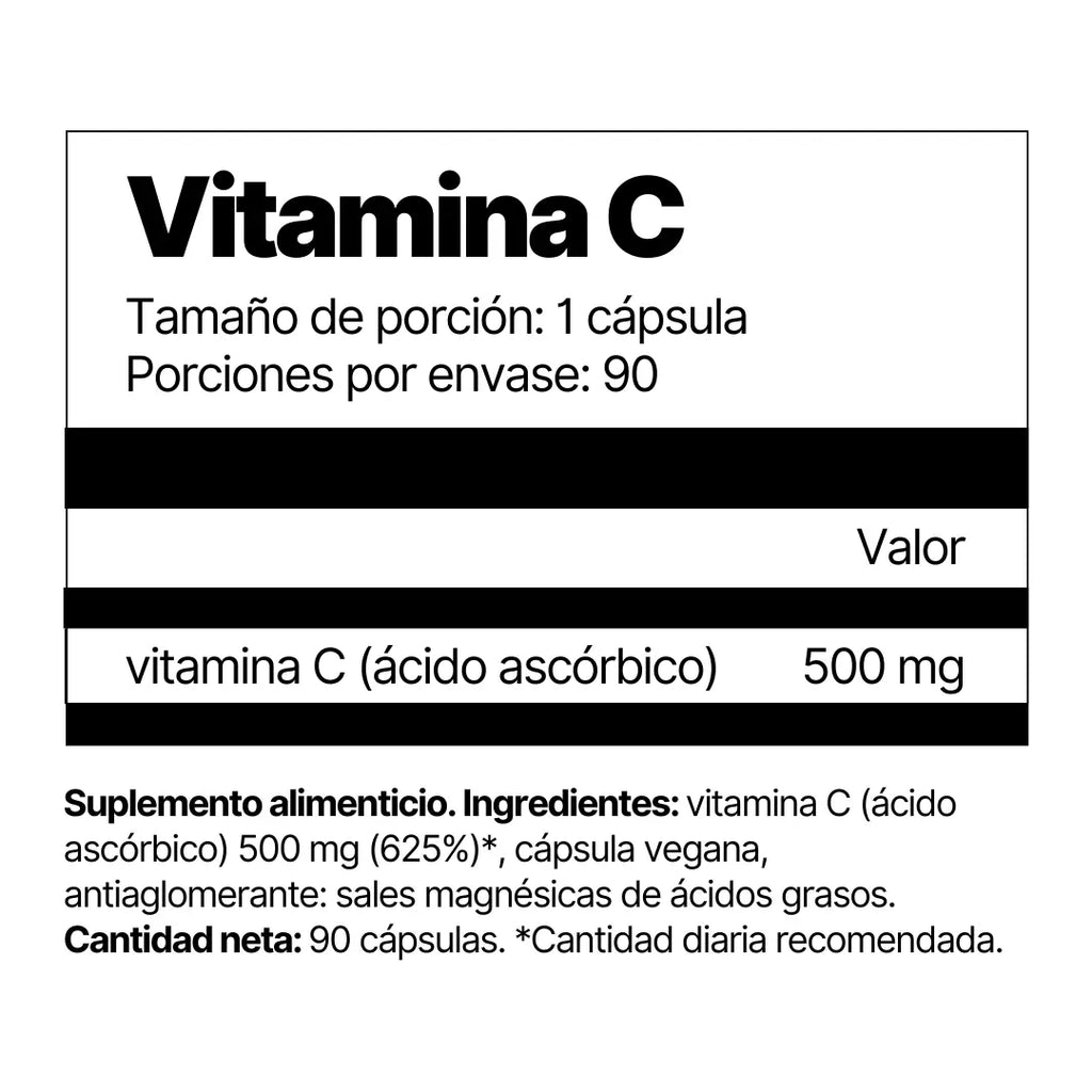 Suplemento alimenticio. Ingredientes: vitamina C (ácido ascórbico) 500 mg (625%)*, cápsula vegana, antiaglomerante: sales magnésicas de ácidos grasos. Cantidad neta: 90 cápsulas. *Cantidad diaria recomendada.